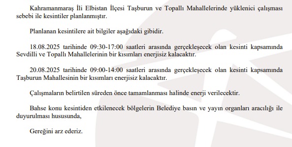 Kahramanmaraş İli Elbistan Taşburun ve Topallı Mahallelerinde yüklenici çalışması sebebi ile kesintiler planlanmıştır.