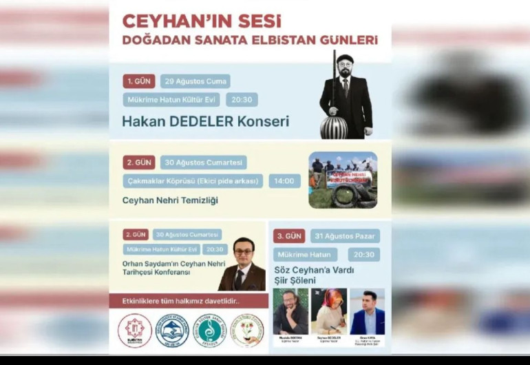 Elbistan Belediyesi, Ceyhan Nehri’nin eşsiz doğasını, kültürünü ve sanatını bir araya getiren “Ceyhan’ın Sesi: Doğadan Sanata Elbistan Günleri” etkinliklerini başlatıyor. 29-30-31 Ağustos tarihleri arasında düzenlenecek etkinlikler, şehrin kültürel zenginliğini ve doğa bilincini pekiştirmeyi amaçlıyor.