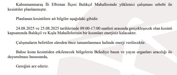 24.08.2025 tarihinde 09:00-17:00 saatleri arasında gerçekleşecek olan kesinti kapsamında Balıkçıl ve Kışla Mahallelerinin bir kısımları enerjisiz kalacaktır