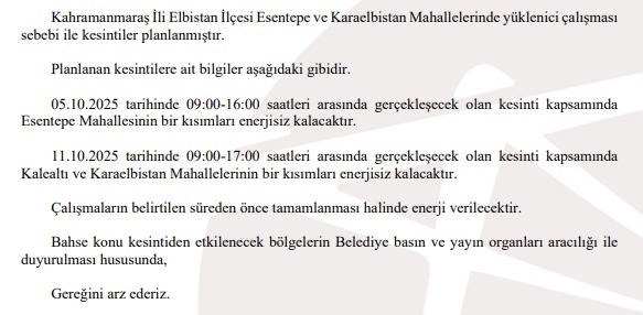 11.10.2025 tarihinde 09:00-17:00 saatleri arasında gerçekleşecek olan kesinti kapsamında Kalealtı ve Karaelbistan Mahallelerinin bir kısımları enerjisiz kalacaktır