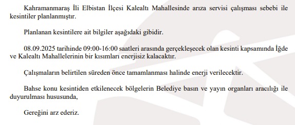 Kahramanmaraş İli Elbistan Kalealtı Mahallesinde arıza servisi çalışması sebebi ile kesintiler planlanmıştır.