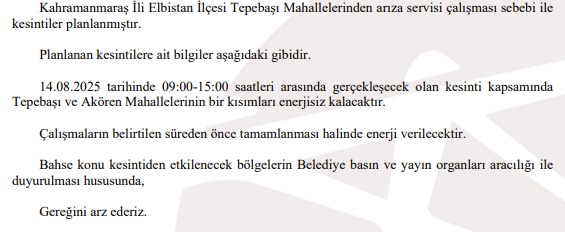 14.08.2025 tarihinde 09:00-15:00 saatleri arasında gerçekleşecek olan kesinti kapsamında Tepebaşı ve Akören Mahallesinin bir kısımları enerjisiz kalacaktır.